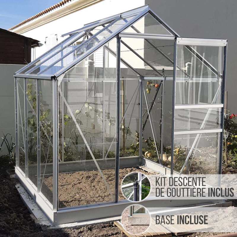 Serre de jardin LAMS Allium 1,93 m x 1,93 m – Hauteur faîtage 2,08 m – Hauteur gouttière 1,37m – Verre trempé transparent – Connecteurs et descentes de gouttière inclus – Base incluse