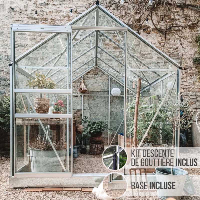 Serre de jardin LAMS Allium 1,93 m x 2,55 m – Hauteur faîtage 2,08 m -Hauteur gouttière 1,37m – Verre trempé transparent – Connecteurs et descentes de gouttière inclus – Base incluse