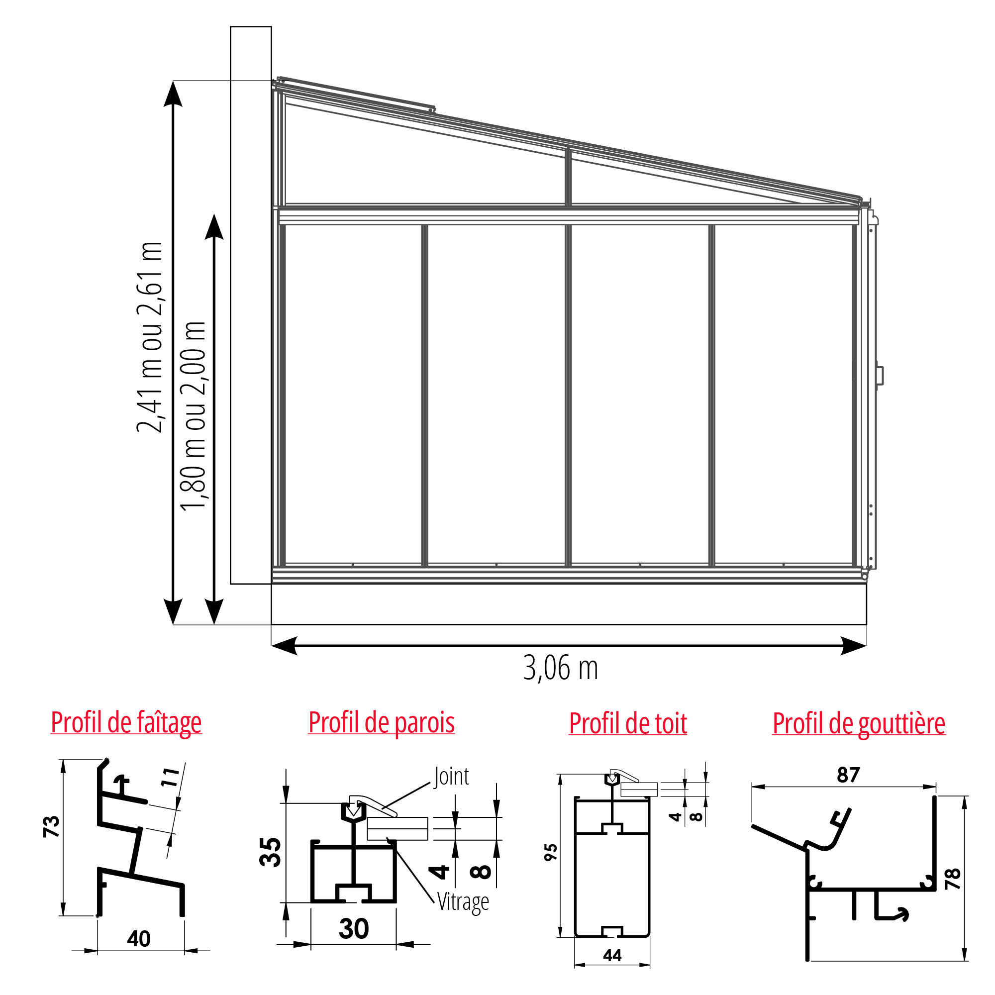 Dimensions de la serre de jardin LUXIA adossée avec une largeur de 3,06 m