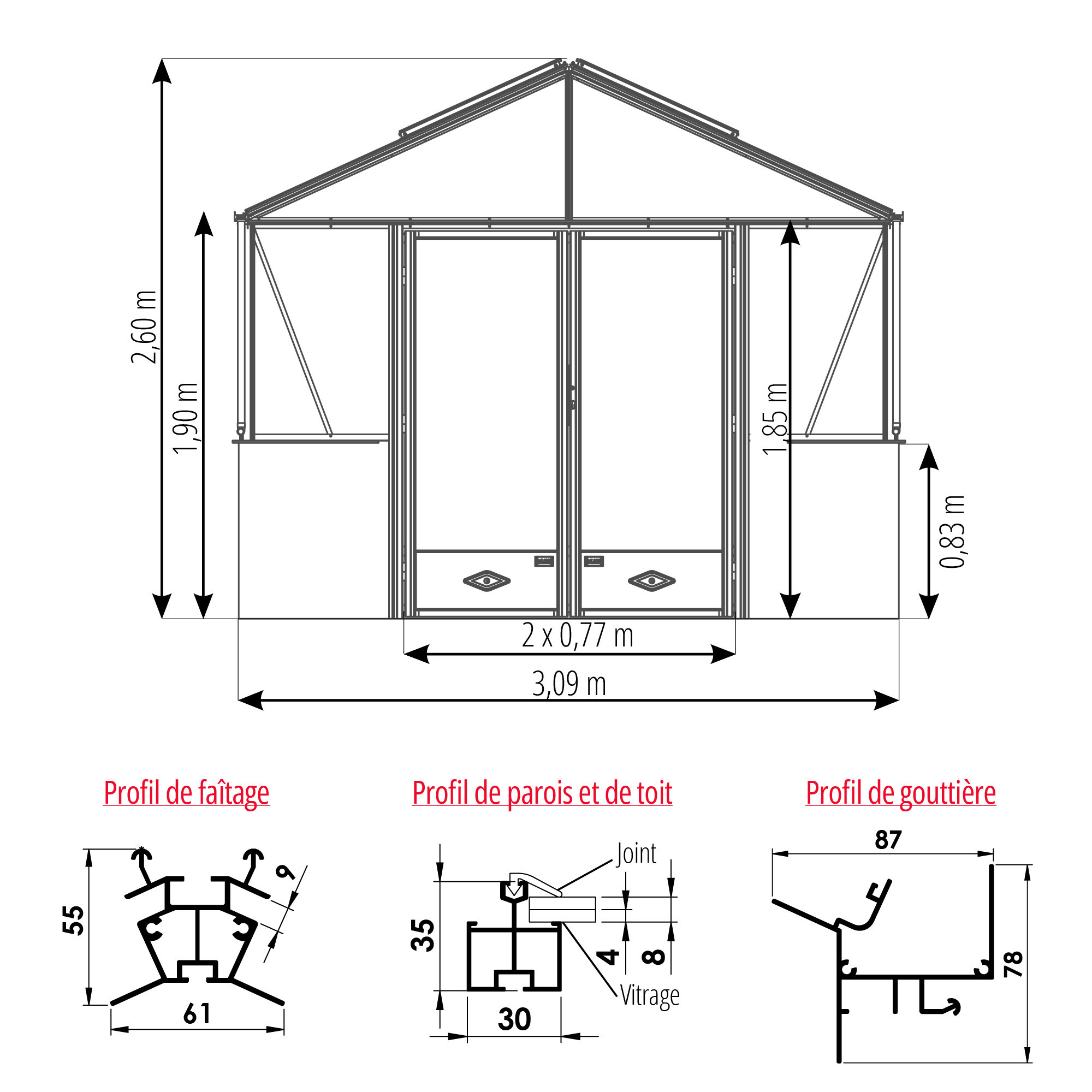Dimensions de la serre de jardin LUXIA sur muret avec une façade de 3,09 m